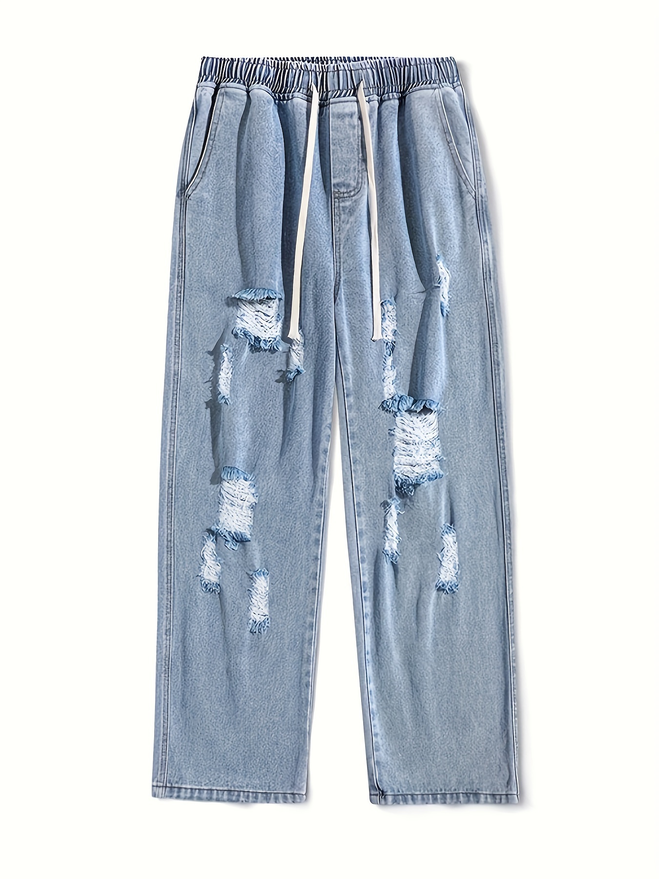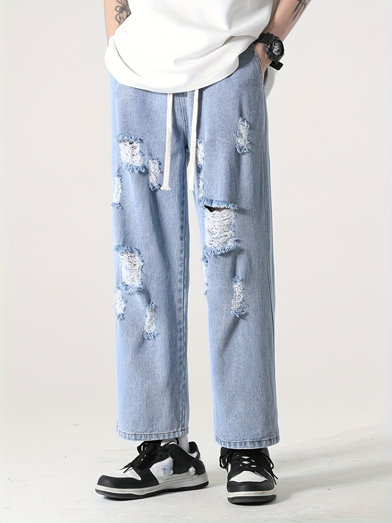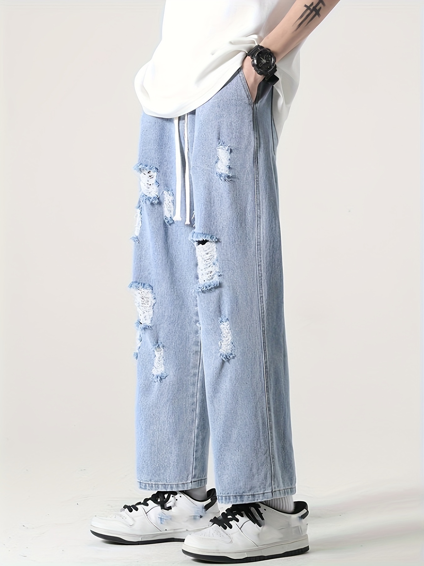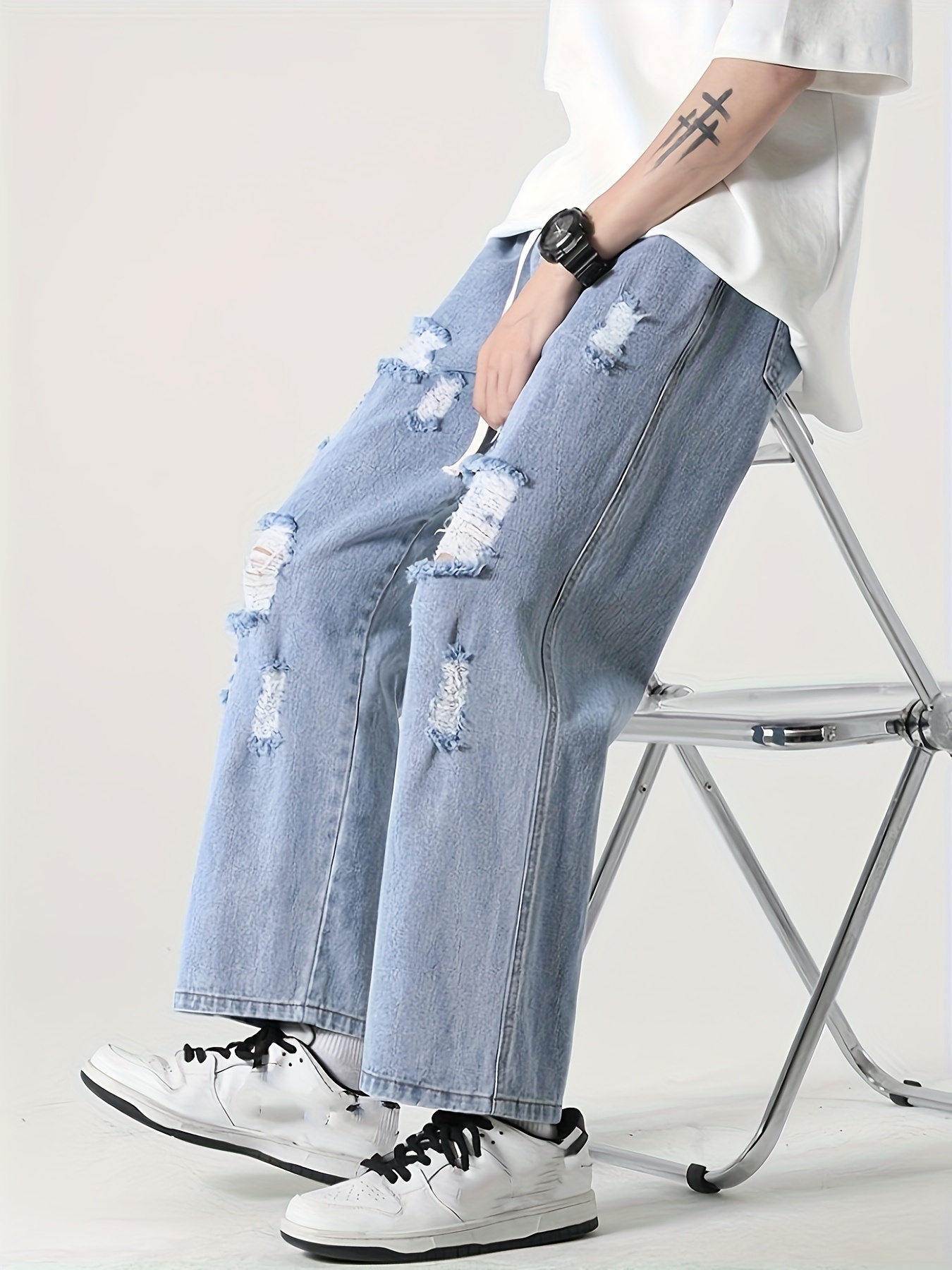 Cotton Blend Ripped Jeans for Adults - Casual Straight-Leg Cropped Pants with Distressed Detail, Non-Stretch Solid Color Summer Denim, Korean Style Hip Hop Fashion
