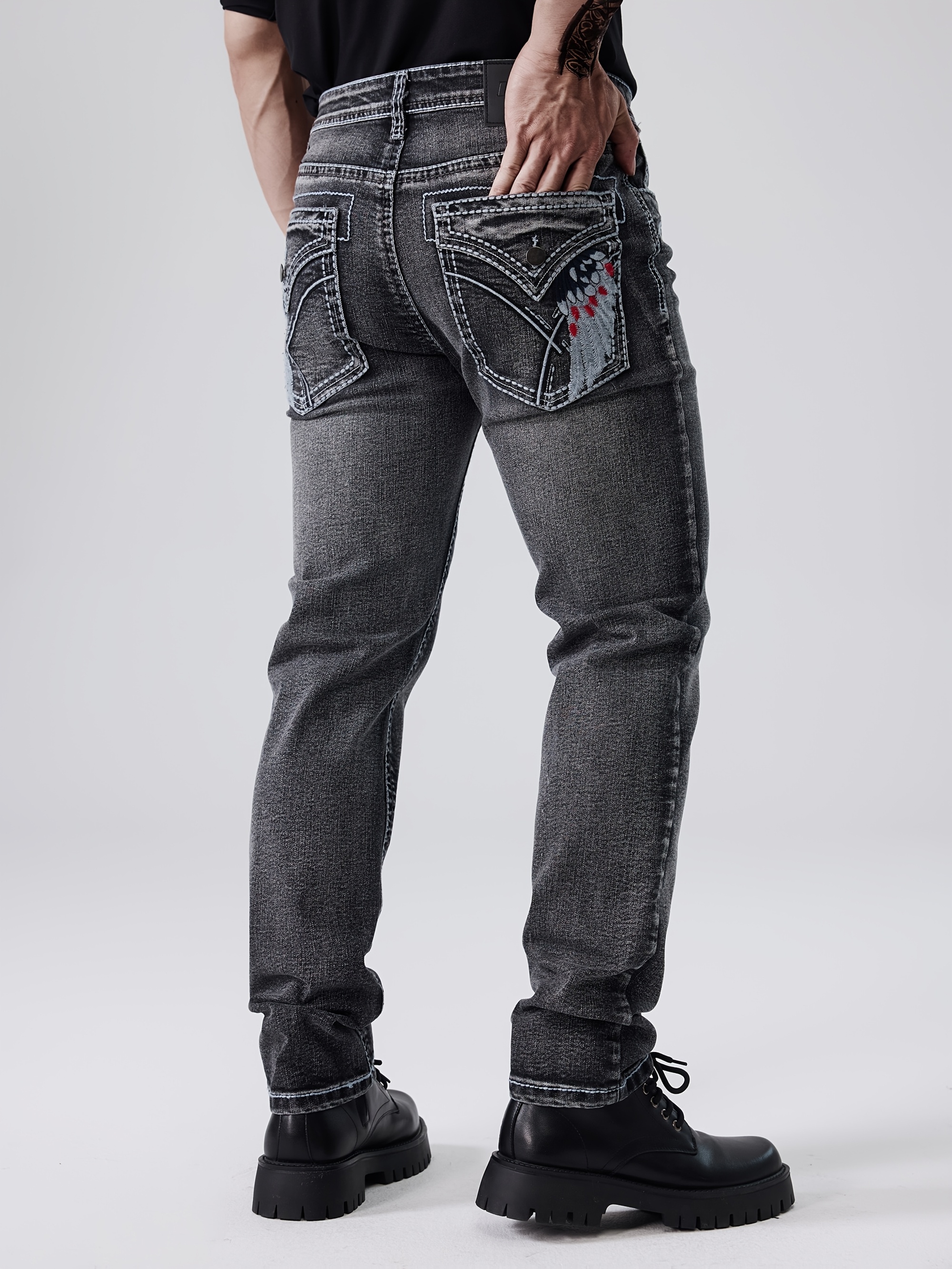 ESDVQ Men's Vintage-Inspired Embroidered Stretch Jeans - Slim Fit, Cotton Blend Denim with Pockets