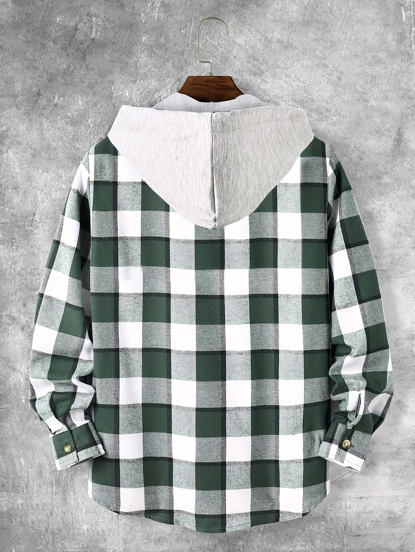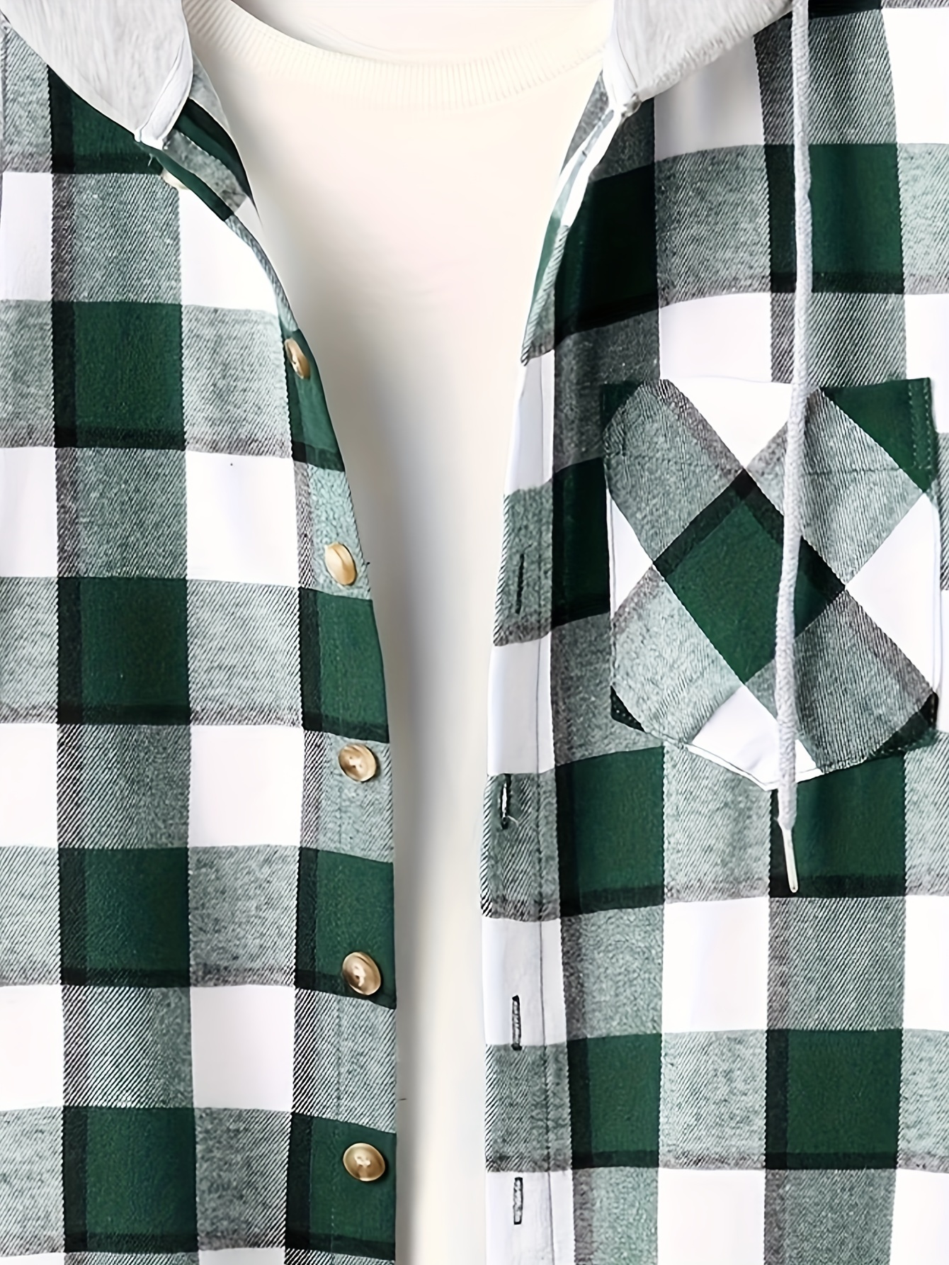 Fashionable And Versatile Men's College Style Casual Plaid Hoodies Button Drawstring Shirt Jacket, Suitable For Outdoor