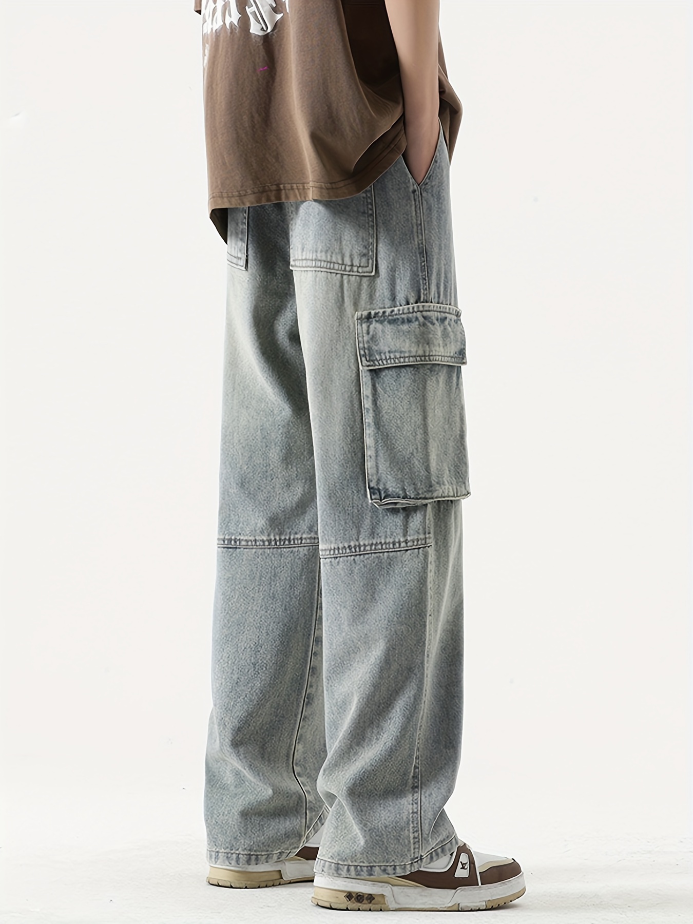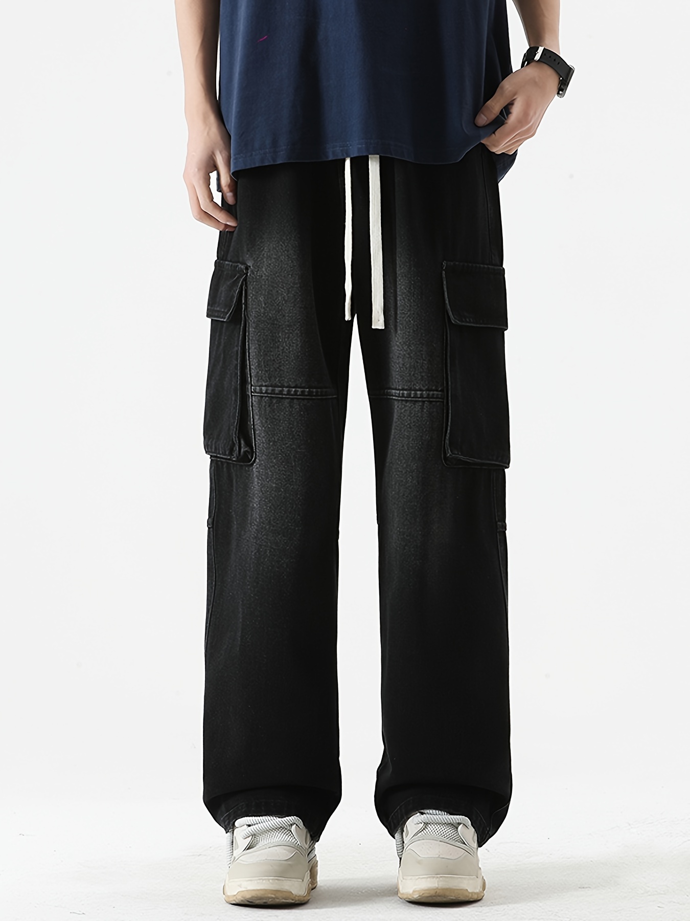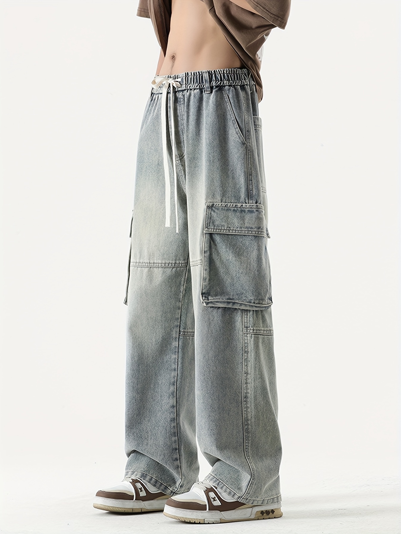 Men's Loose Gradient Color Denim Trousers With Pockets, Causal Drawstring Cotton Blend Jeans For Outdoor Activities