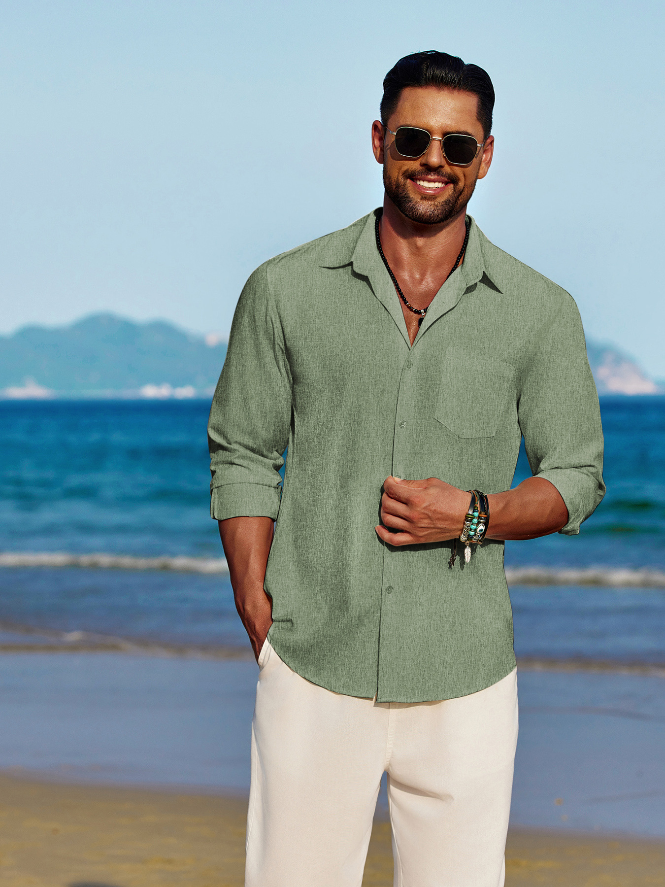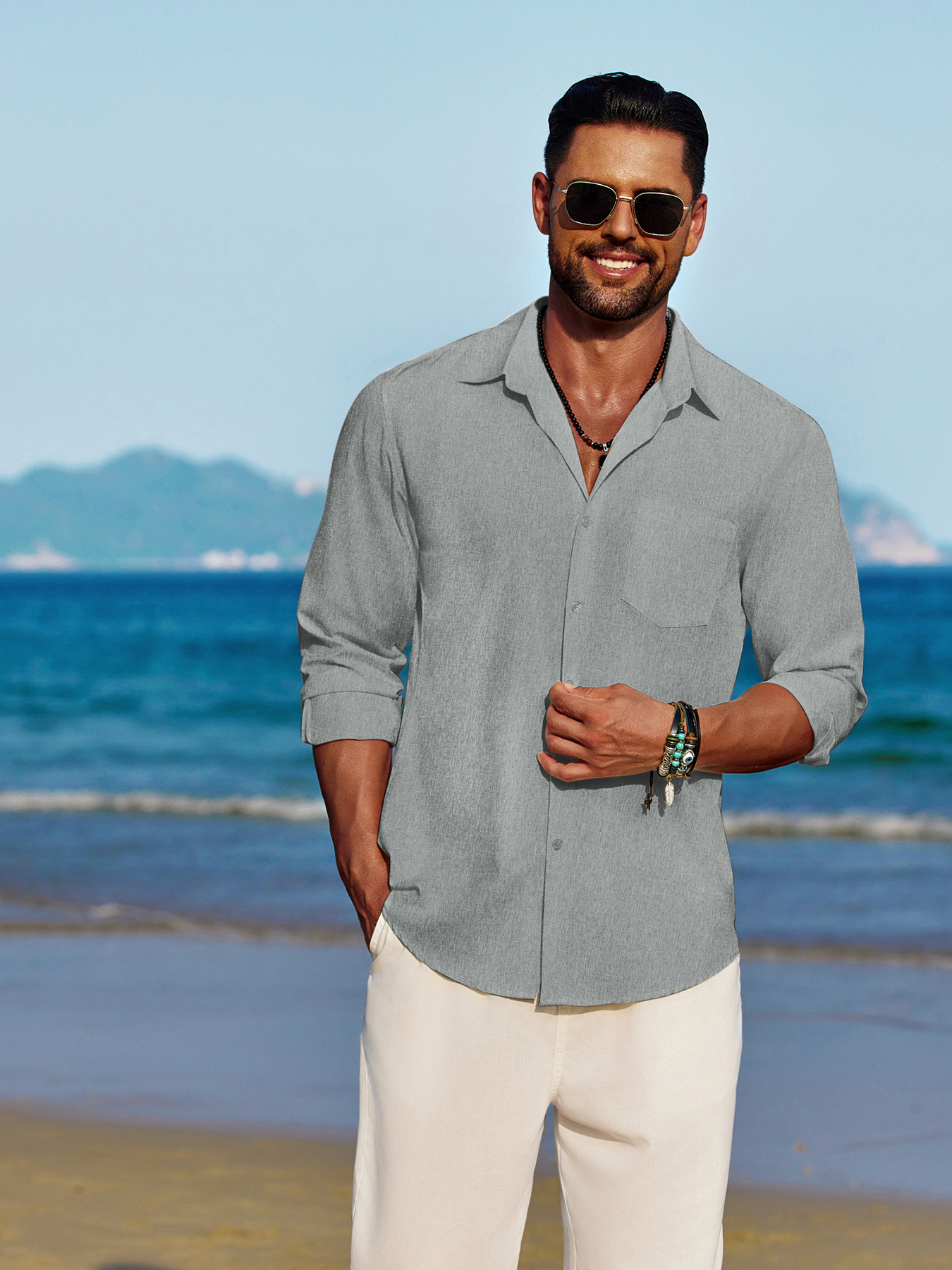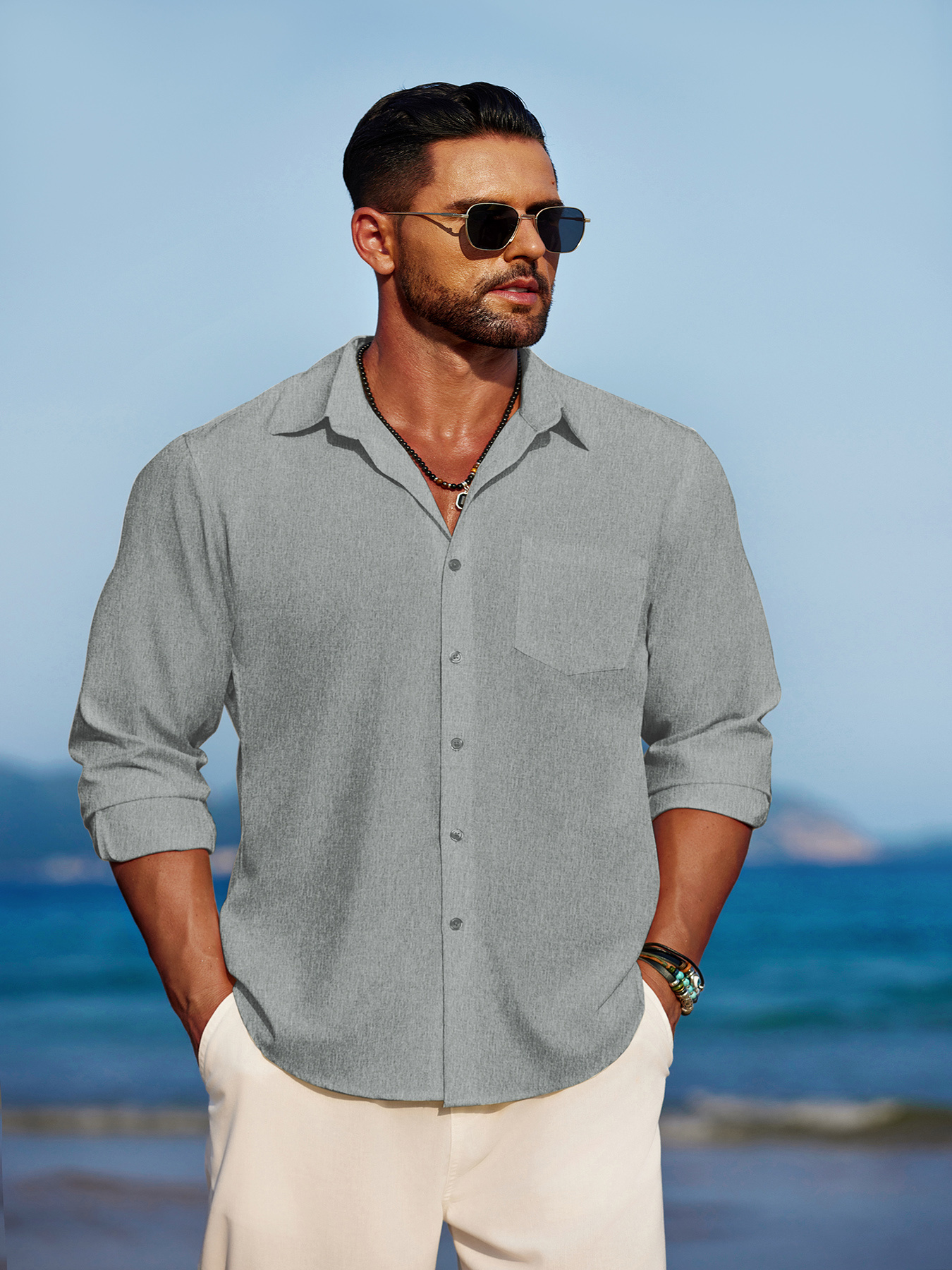 Men'S Polyester Chambray Casual Dress Shirt, Sexy Lapel Collar, Long Sleeve, Solid Color, Slight Stretch Fabric, with Front Slit Hem, Single Breasted Placket, for All-Season Party Wear