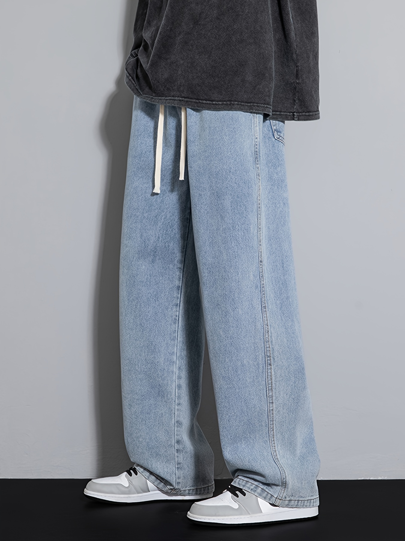 Men's Street Style Wide Leg Denim Jeans, Casual Drawstring Pants, Hip-Hop Loose Fit Jeans